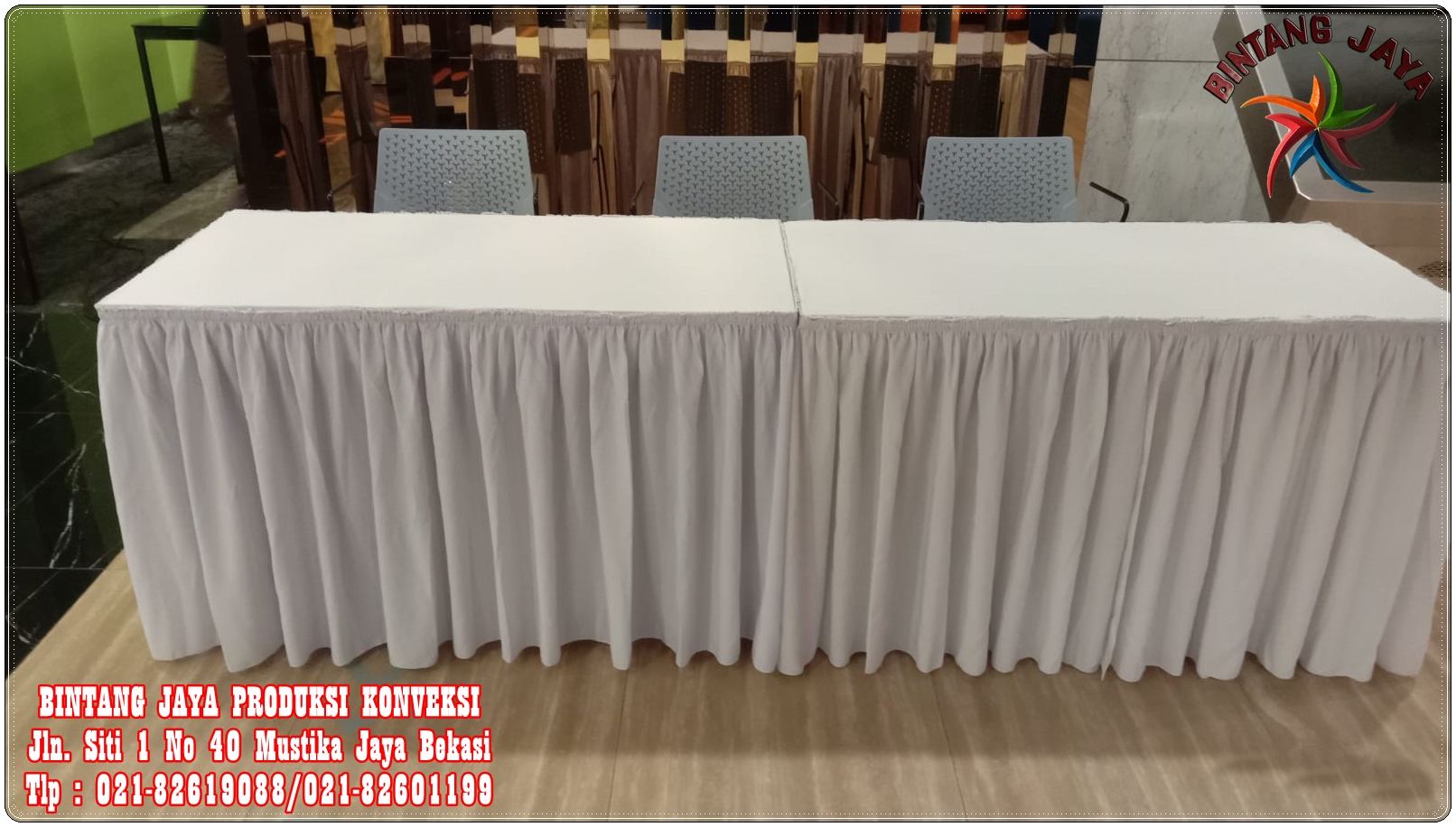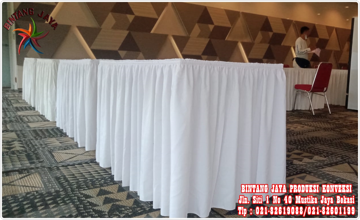 Kami menjual taplak meja dengan model skirting untuk berbagai pilihan meja seperti meja kotak, meja panjang, meja bulat dan meja lainnya. Kami menjual taplak meja dengan pilihan terbaik dengan sistem free order pesan berapapun akan kami siap layani. Kami menjual taplak meja dengan harga grosir atau harga eceran siap kirim sampai ke lokasi anda.